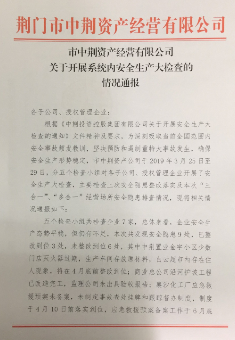 上一篇:中荊置業(yè)公司狠抓三供一業(yè)施工安全 | 下一篇:荊門市中荊資產(chǎn)經(jīng)營(yíng)有限公司 取得安全生產(chǎn)事故應(yīng)急預(yù)案?jìng)浒缸C